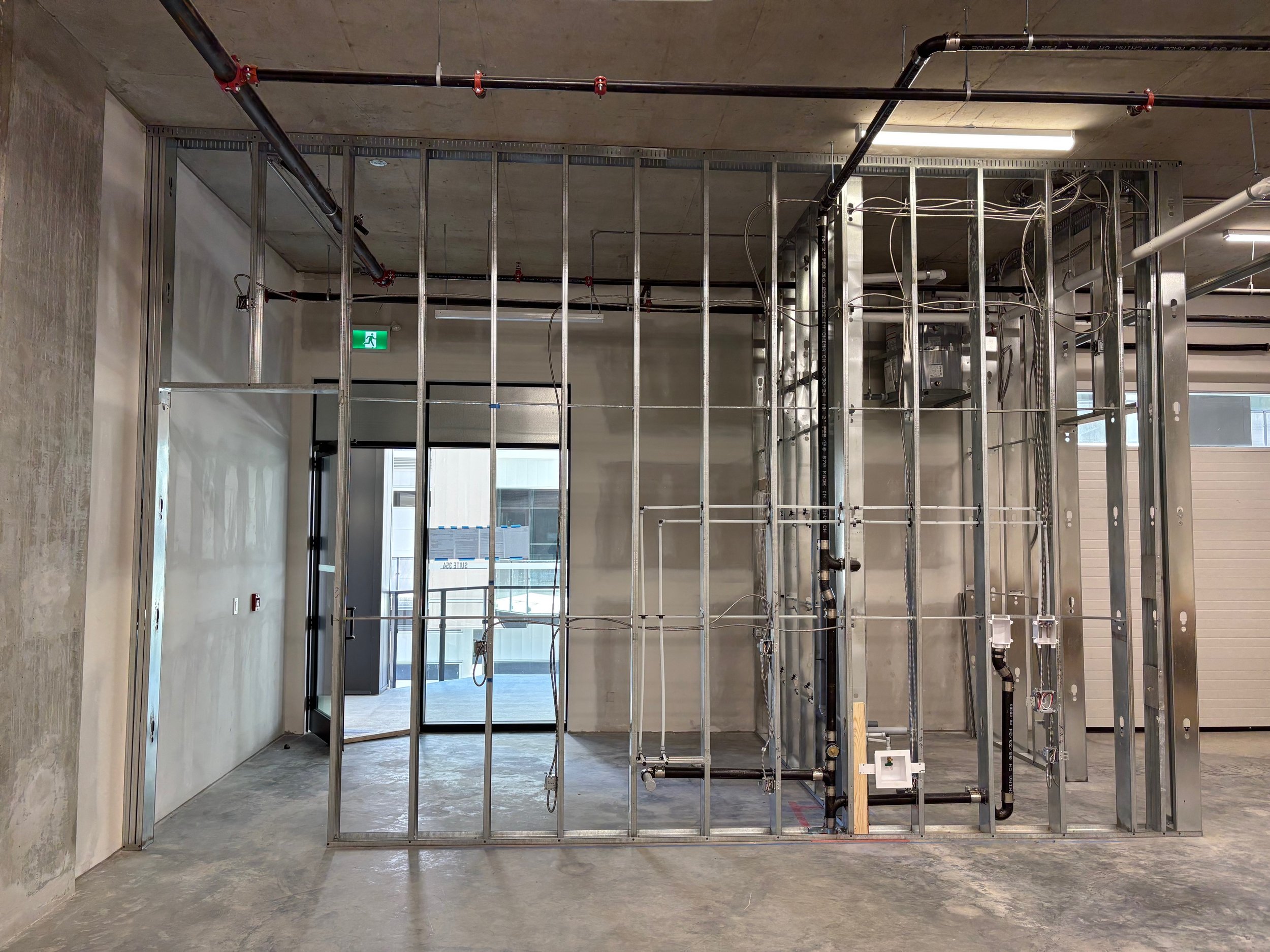 As the stud walls went up, the space started to take shape. Exposed plumbing and electrical lines were routed through the new walls. This stage offered a rare look at the structure behind the finished shop — the kind of detail that disappears once the walls are closed.
